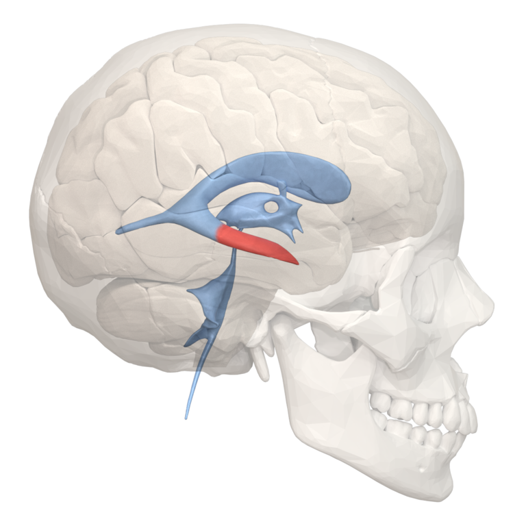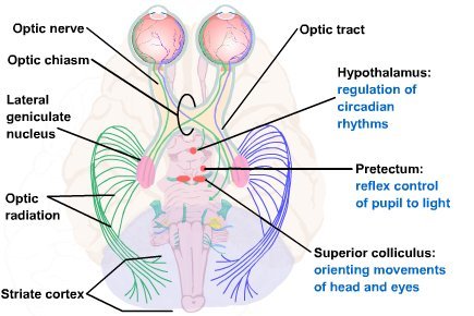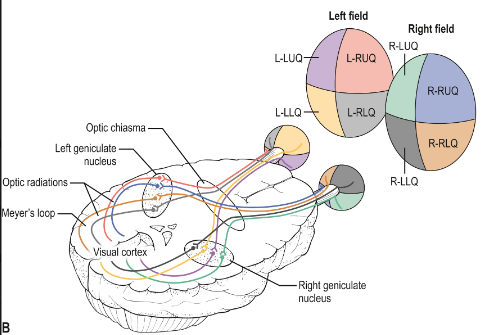 those destined for the lower half of the visual cortex take a wider sweep into the loop around the tip of the inferior horn of the lateral ventricle (see pic) than those destined for the upper half of the visual cortex