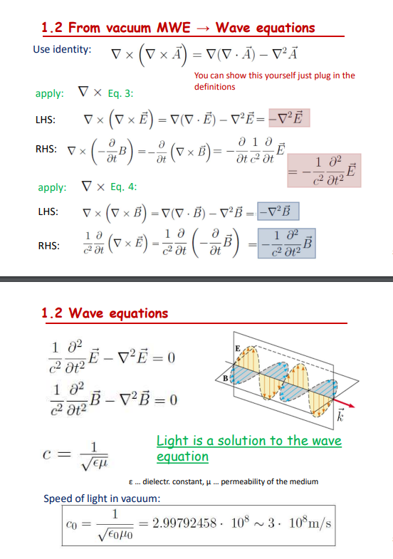 Use the following equations a vector identity to derive 2 wave equations for light (use eq for both Electric and Magnetic fields).