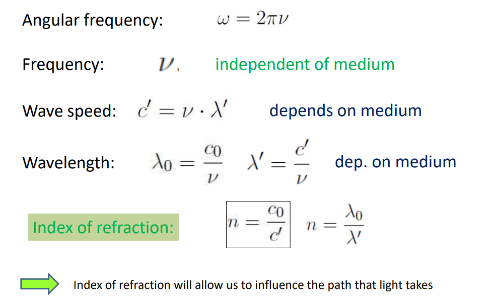 What is the eq of the index of refraction of a material? (a) in terms of c, (b) in terms of wavelength.