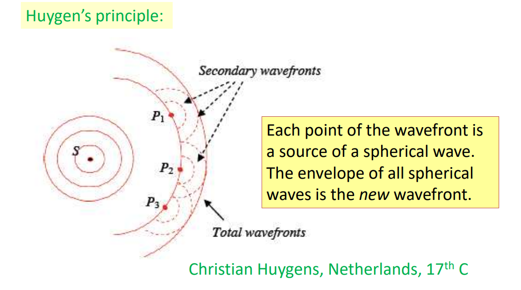 Each point of a wavefront is a source of a spherical wave. The envelope of all spherical waves is the NEW wavefront.