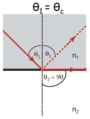 What happens when the angle of incidence = the critical angle?