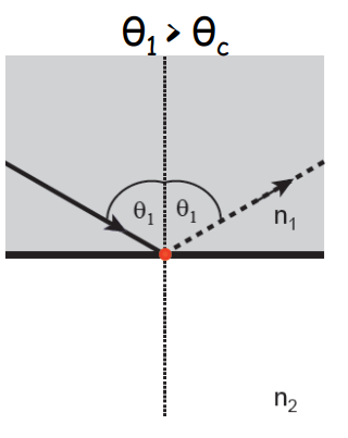 When the angle of incidence is greater than the critical angle, NO light is refracted, ALL rays are reflected internally- TOTAL INTERNAL REFLECTION OCCURS.