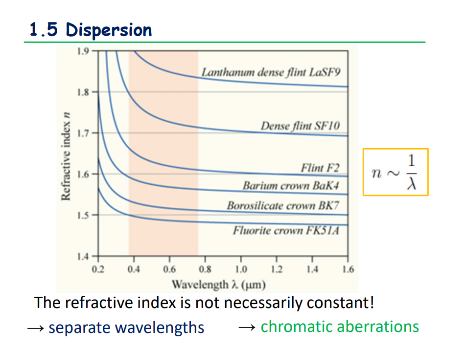 This causes dispersion of light/seperation of light of different wavelengths- called chromatic abberations.