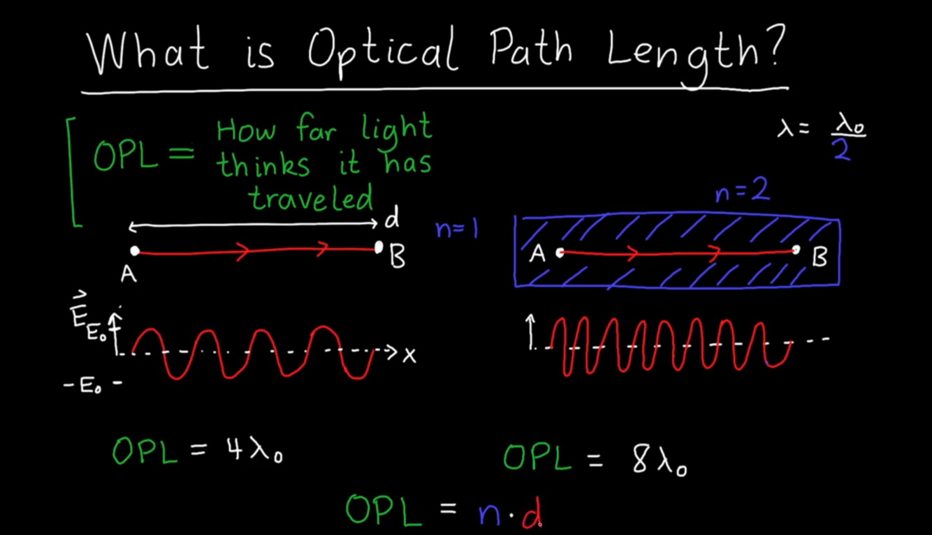 Optical path length is how far light thinks it has travelled, when n = 2 the total number of wavelengths doubles* (increases to 8 from 4), so from light’s perspective it has moved double the distance.