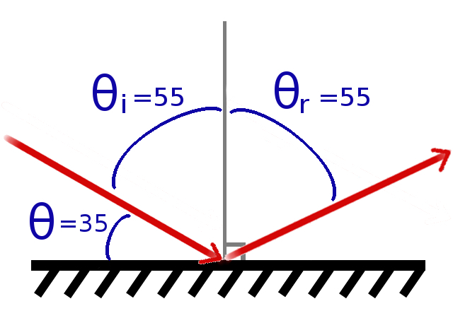 Remember: the angles of incidence and reflection must be measured relative to the surface’s normal. 90 - 35 = 55. θi and θr are shown below.