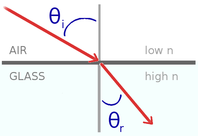 How is the path of a light ray affected when the ray crosses a boundary from air (low n) into glass (high n)?