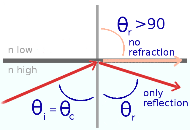 The critical angle θc is the angle of incidence in one medium at which the angle of refraction into the new medium would become 90 degrees or higher.