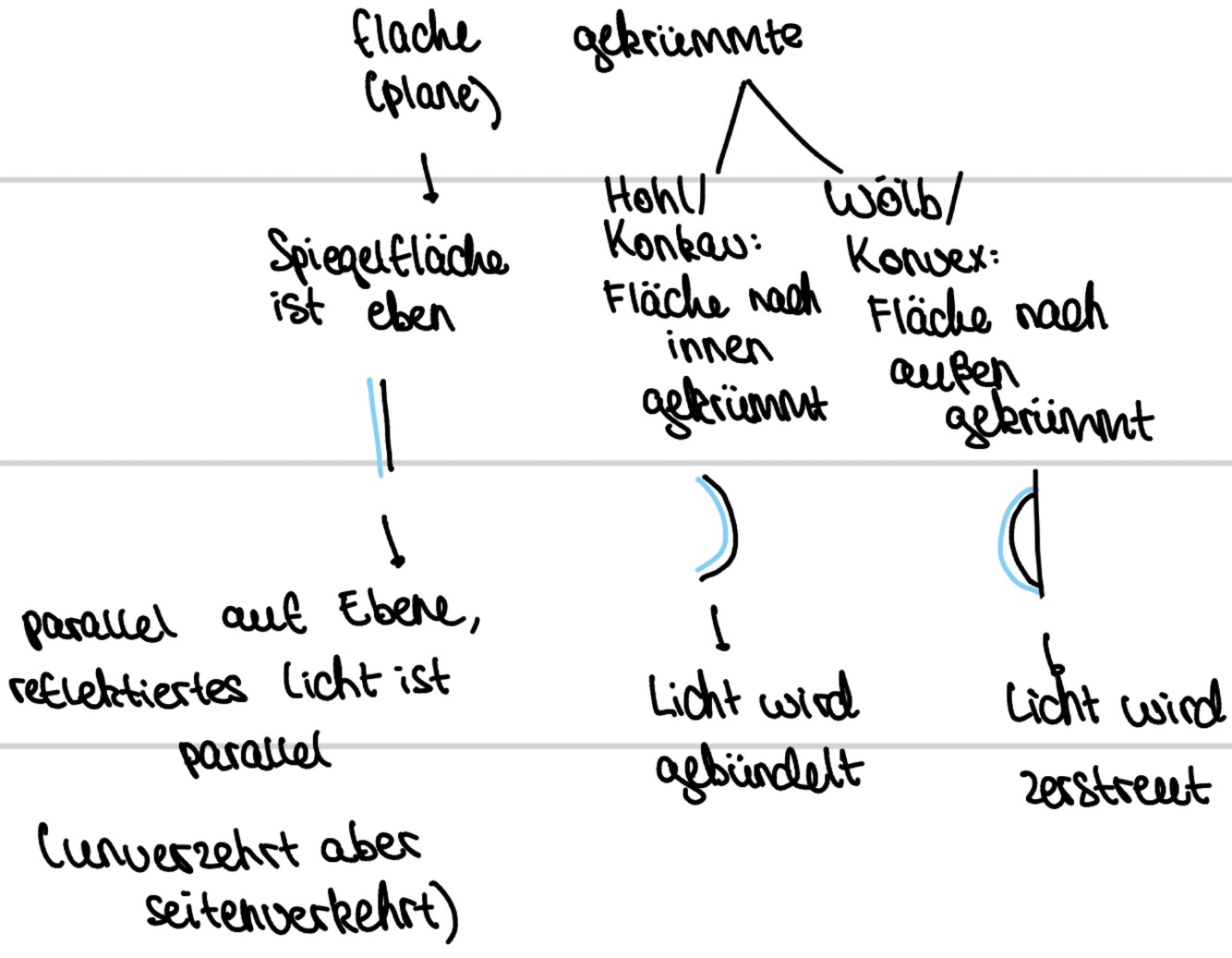 Spiegel: reflektiert, Konkav: Sammel, Konvex: Zerstreut