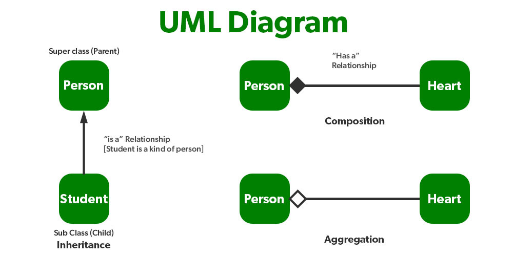 Arrows represent inheritance (“is a”) and diamond arrow heads represent composition and aggregation (“has a”)