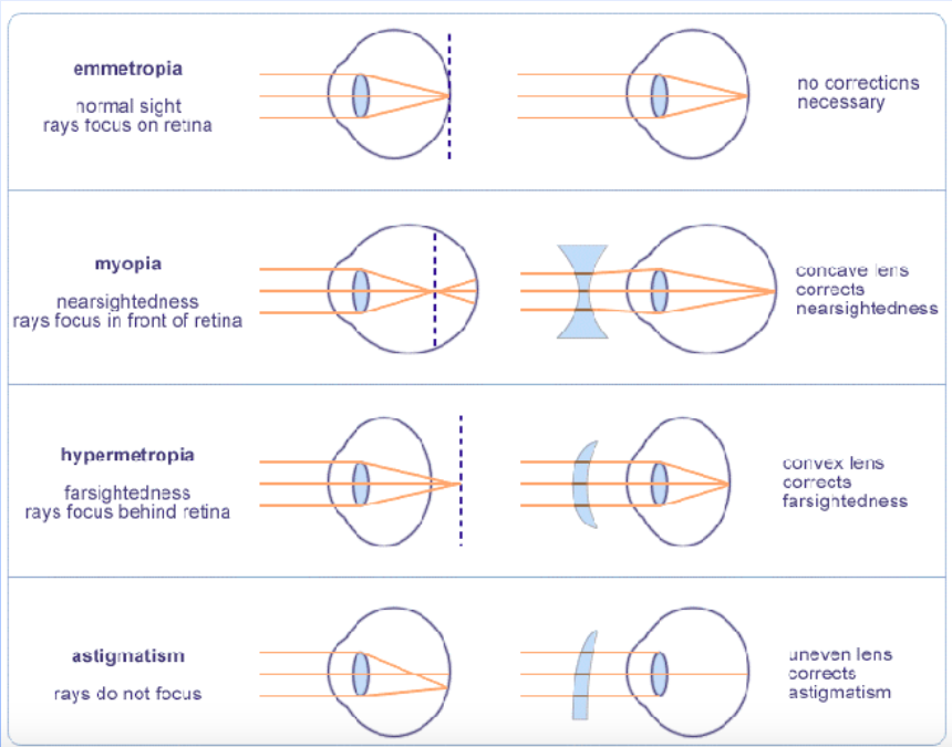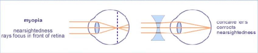 Un rayon de lumière qui entre dans un oeil myope est excessivement réfracté, et donc la mise au point se fait antérieure à la surface de la rétine. Pour corriger une myopie, une lentille divergente est nécessaire.