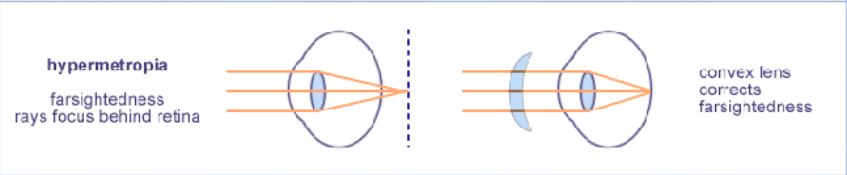 Un oeil hypermétrope est un oeil qui est généralement plus court que la normale et ainsi, la mise au point se fait postérieure à la surface rétinienne. Pour corriger une hypermétropie, il faudrait utiliser une lentille convergente.