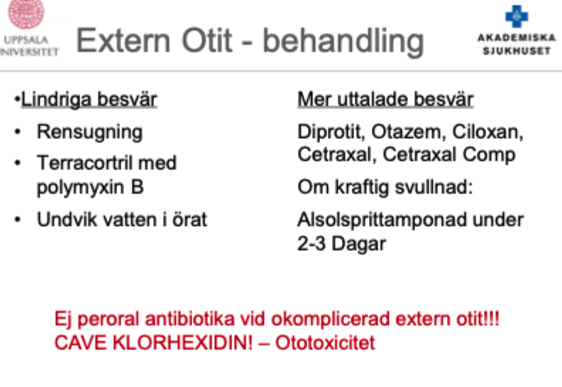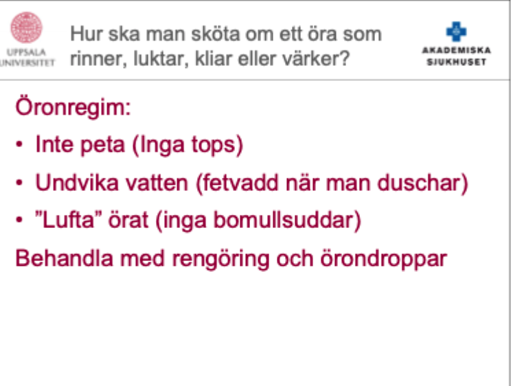 - Konservativt öronregim, rengöring.