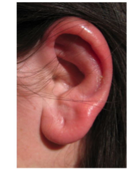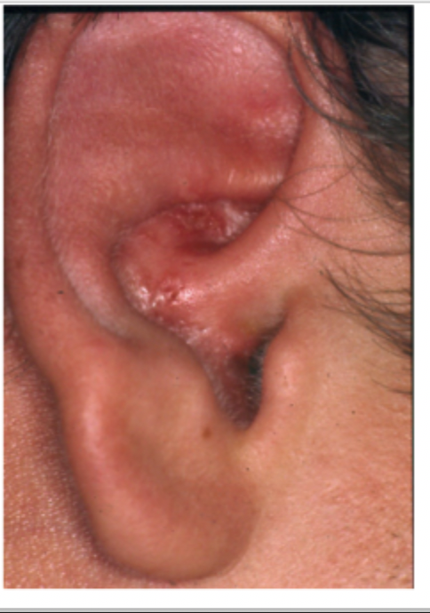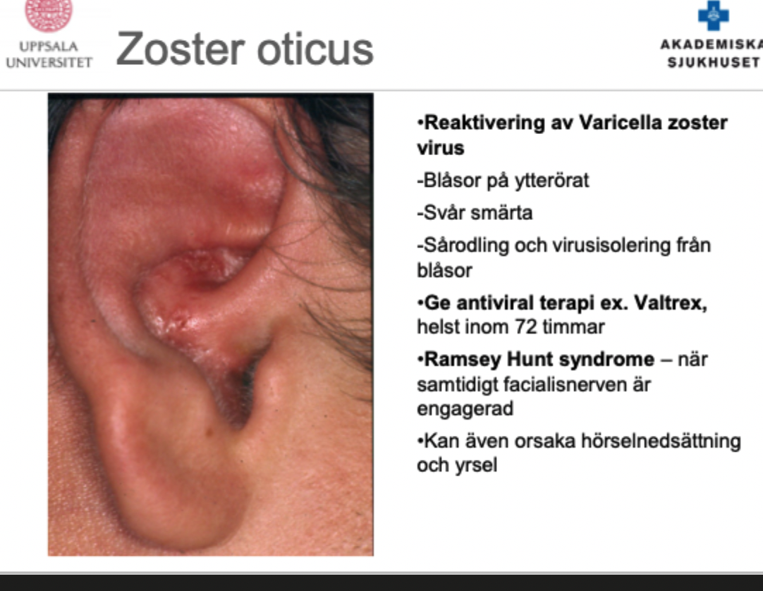 Patienten har blåsor på ytterörat med svår smärta.
