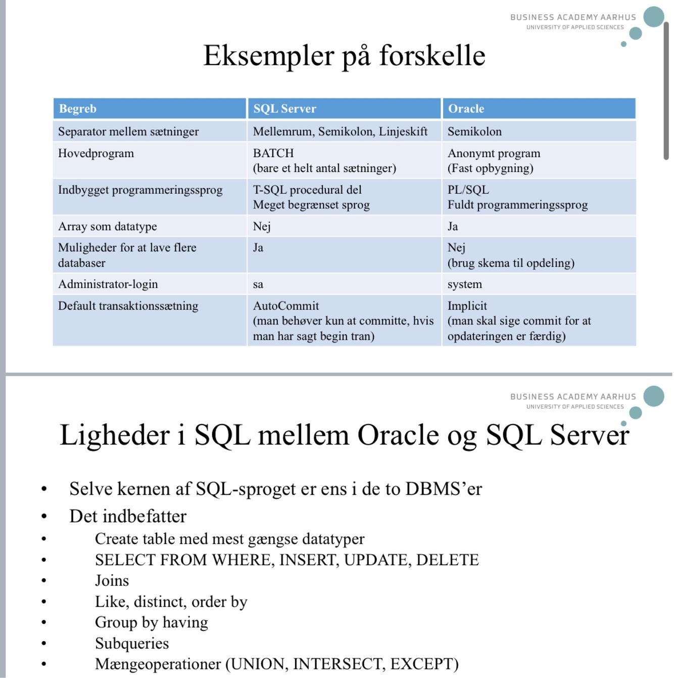 Kan du nævne nogle forskelle og ligheder mellem oracle og SQL server?