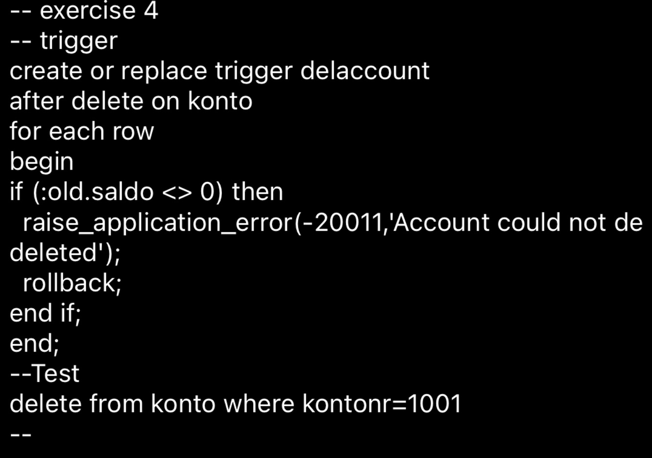 Koden tjekker derefter, om saldoen (:old.saldo) for den slettede række er forskellig fra 0. Hvis dette er tilfældet, hæves en applikationsfejl (-20011), og en rollback udføres for at fortryde sletningen.