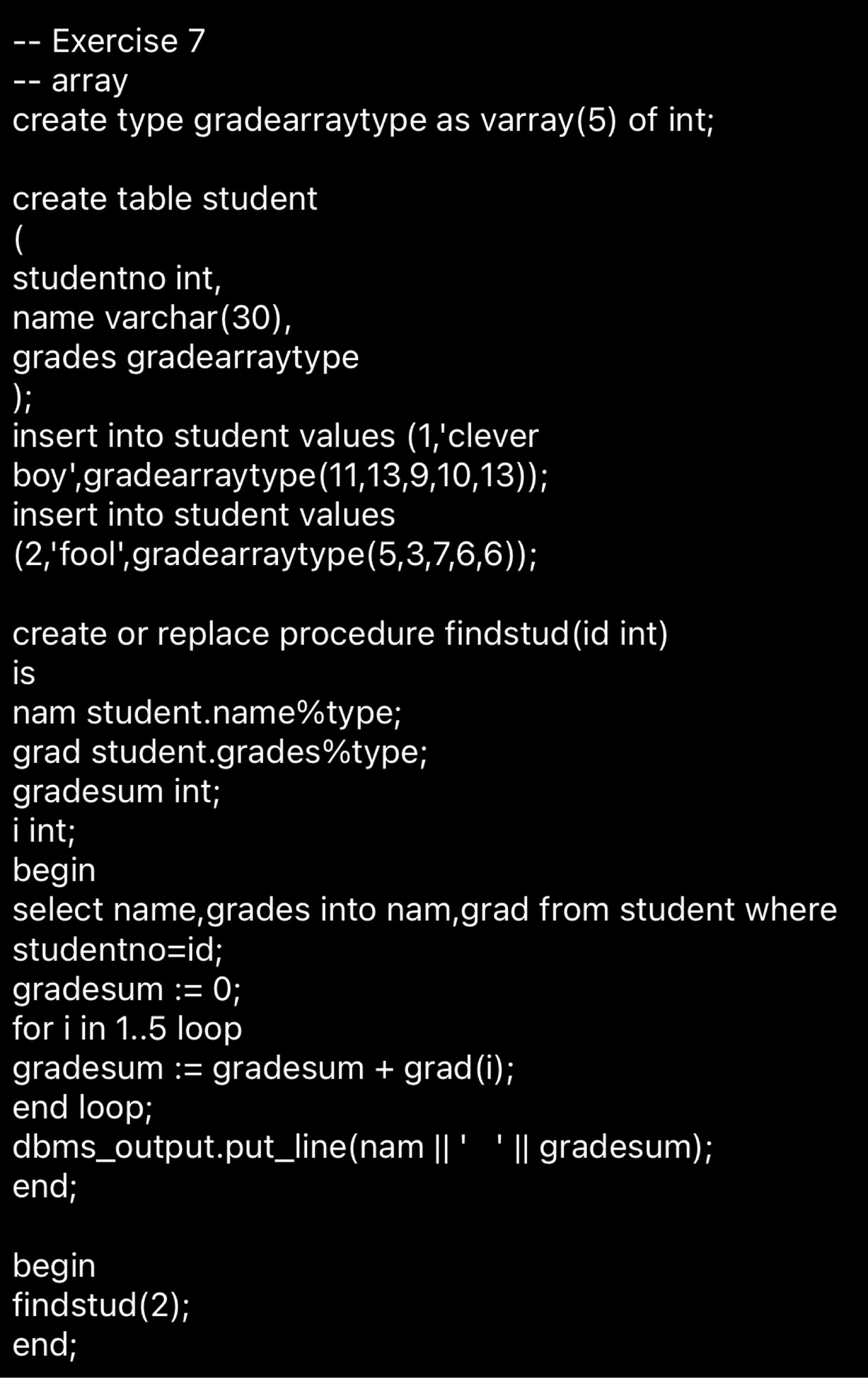 Der bliver lavet et array som indeholder karakter. Og der blev lavet en stores procedure som finder en studerende og sender gennemsnittet af alle hans karakterer.