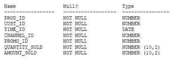 Examine the structure of the sales table, which is stored in a locally managed tablespace with Automatic Segment Space Management (ASSM) enabled.