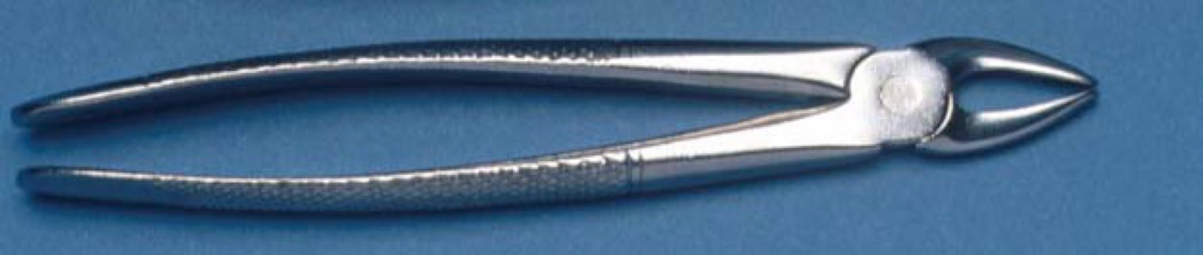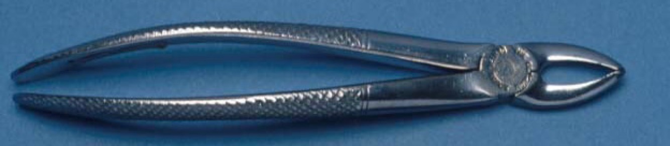 Lower cownhorn forceps. Used for engaging the furcation in lower molars and wedging / pulling the tooth out.