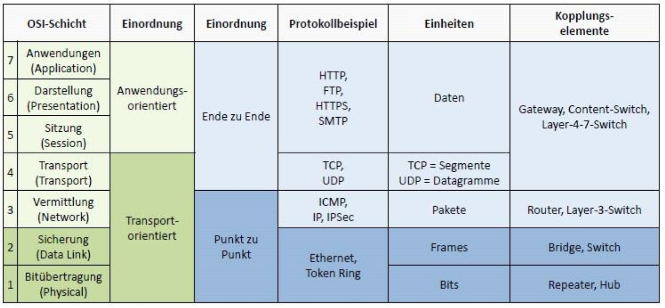 Nennen Sie die Schichten des OSI Layer und zeichnen Sie dazu in eine Tabelle auch die Protokolle/Anwendungen.