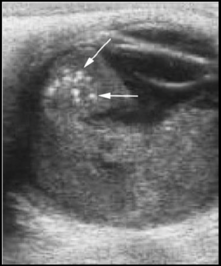Sí, podemos ver lesiones hiperecogénica con calcificaciones