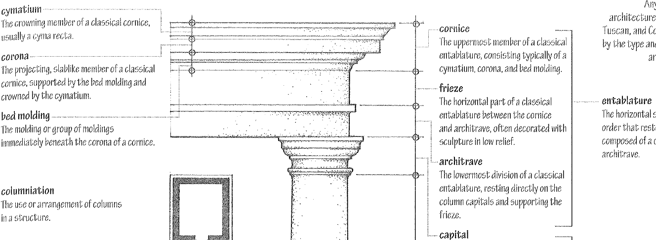 Any of five styles of classical architecture - Doric, Ionic, Corinthian, Tuscan and Composite - characterized by the type and arrangement of column and entablatues employed.