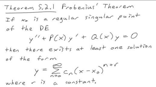Frobenius’ theorem is concerned with the existence and uniqueness of solutions to linear differential equations near singular points.