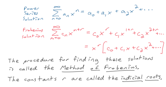 The Frobenius method involves finding a power series solution around a singular point.