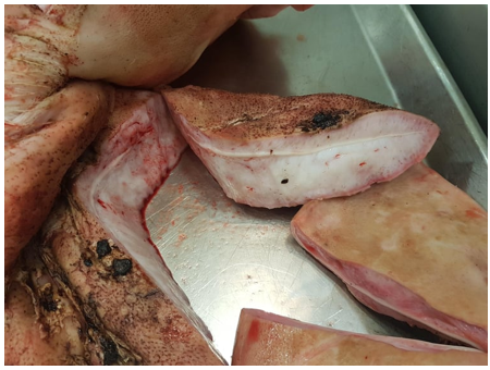 Karakteristisk: ørebrusk er sammenhængende, men der er for meget væv på den ene side af brusken.