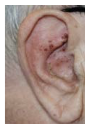 En 65-årig mand har haft nogle gener siden i går; manglende smagssans på højre side af tungen og han hører dårligt på højre øre, som gør ondt, og han er blevet svimmel. OBJ: Billedet viser højre øre med vesikler, der kom frem i dag. Han har perifer højresidig facialisparese siden i går. Weber lateraliseres til venstre. Rinne +/+