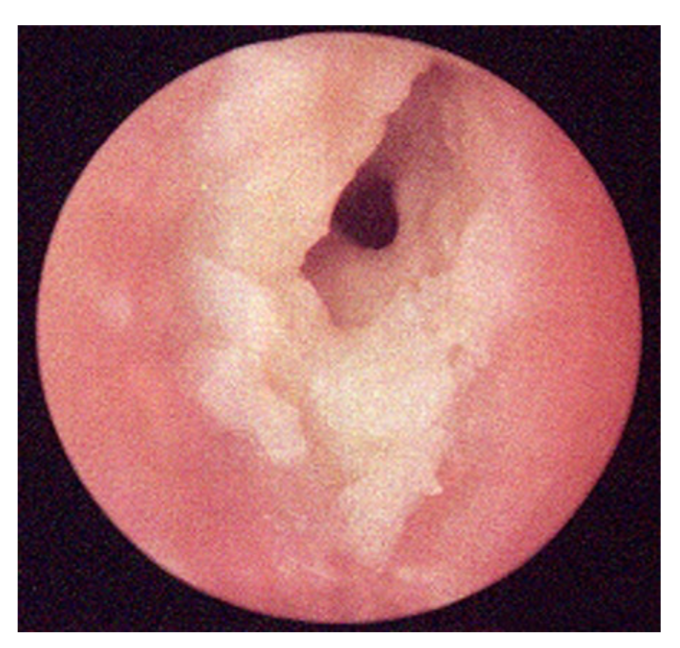 Hvilket af disse fund ved otoskopi vil du forvente ved kolesteatom?
