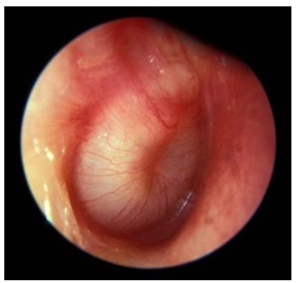 Trommehinderne ser normale ud. Tympanometri viser normalt mellemøretryk på begge sider. Rinne; -/+ og Weber lateraliseres til højre.