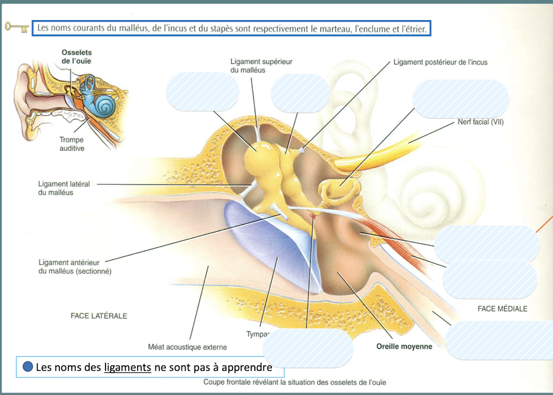 Nomme les 3 osselets de l’ouie et les 2 muscles attachés aux osselets