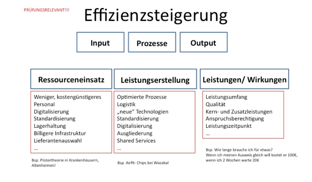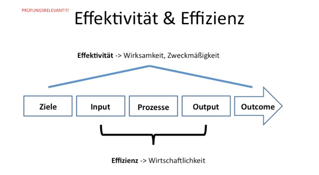 Effektivität umfasst den gesamten Prozess der Wirksamkeit und Zweckmäßigkeit von der Zielfindung bis zum Outcome, hingegen die Effizienz die Wirtschaftlichkeit von Input bis Output bezeichnet.