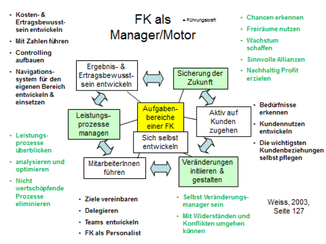 Was sind die Aufgabenbereiche einer Führungskraft, nenne 4 Kernbereiche und davon je 2 Teilaufgaben.