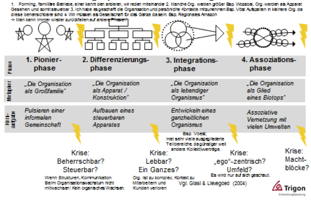 Erkläre die Entwicklungsphasen von Organisationen nach Glasl