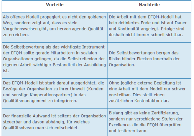 Nenne drei Vor- und drei Nachteile des EFQM Modells