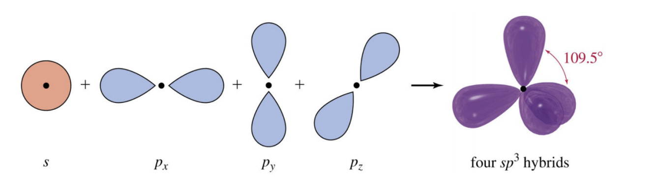 One s and three p orbitals mix to form four identical sp3 hybrid orbitals. Each orbital is dumbbell shaped with one lobe smaller than the other, and the four have corners forming a tetrahedron, and are 109.5 degrees apart from each other