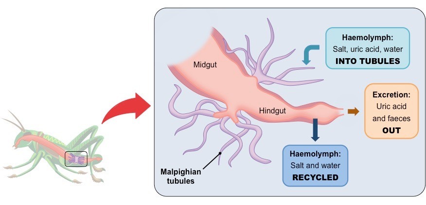 separate waste products from nutrients that are returned to the hemolymph, waste products travel through the tubes as urine. (like a kidney)