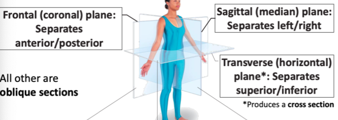 frontal (coronal), sagittal (median), transverse (horizontal)