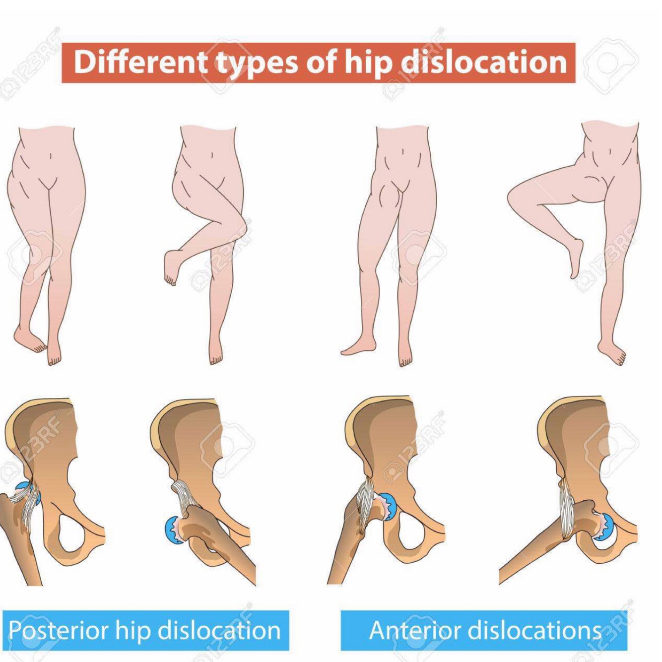 His right leg is shortened, internally rotated, slightly flexed and adducted compared to the left.