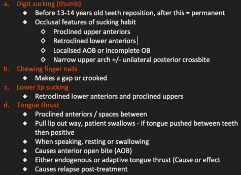 Ortho social history: Habits causing malocclusion and what type of issues these cause?