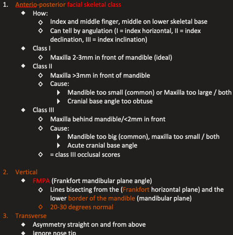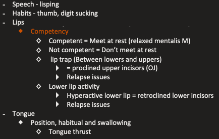 Ortho: extra-oral examination: soft tissue checks? (4)