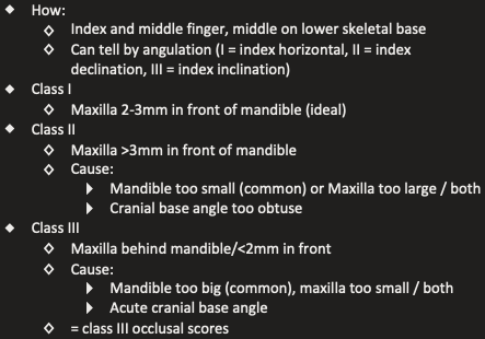 what are the 3 skeletal classes? What causes each? and how would you check this?