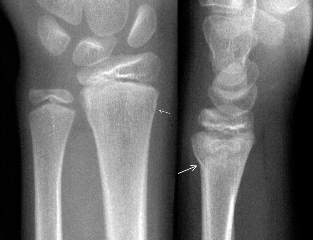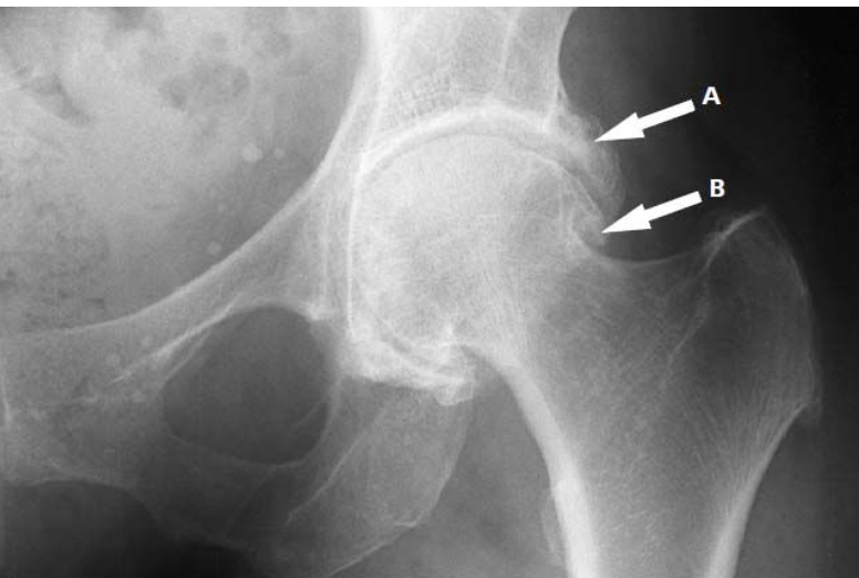 Prüfungsbild: hier ist links statt rechts dargestellt und am Hüftkopf auch unten Osteophyten sichtbar