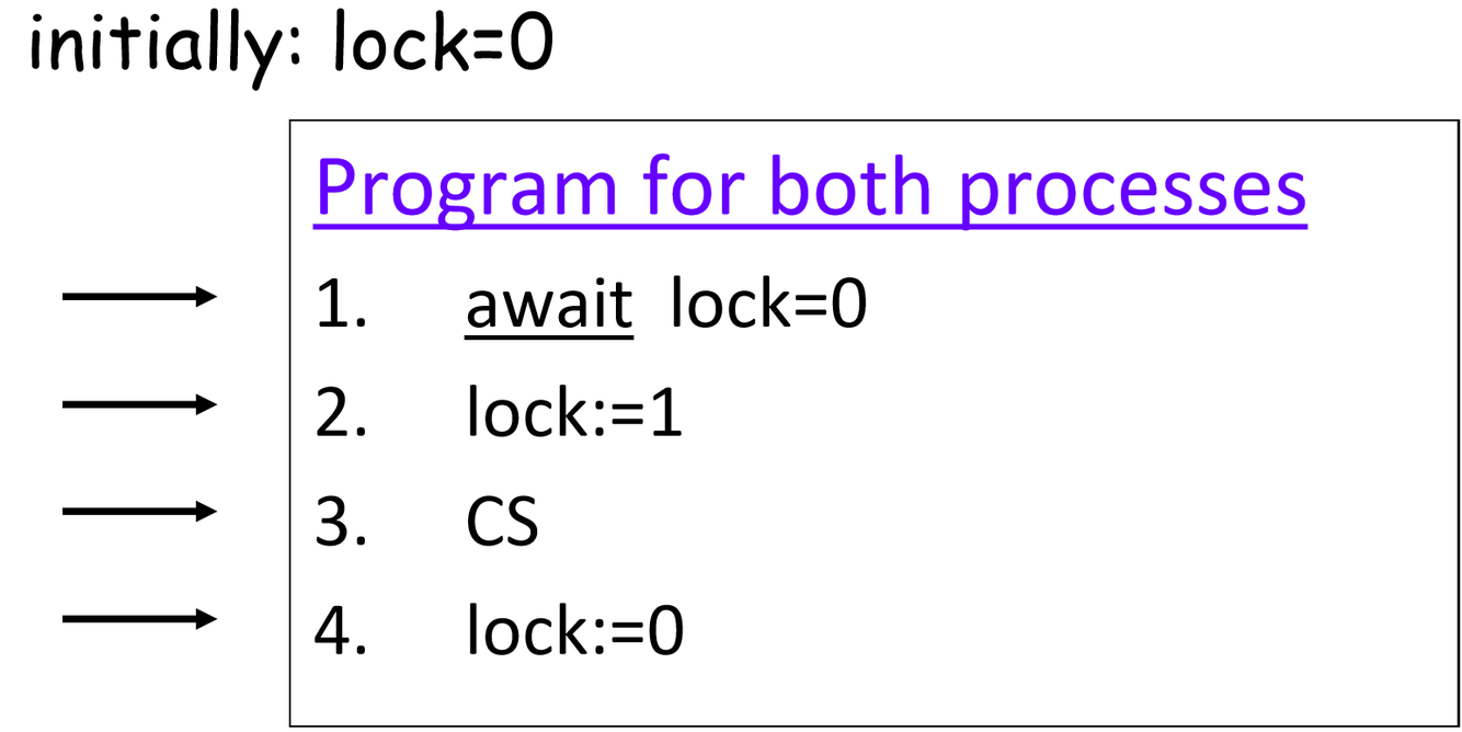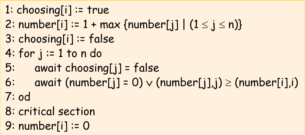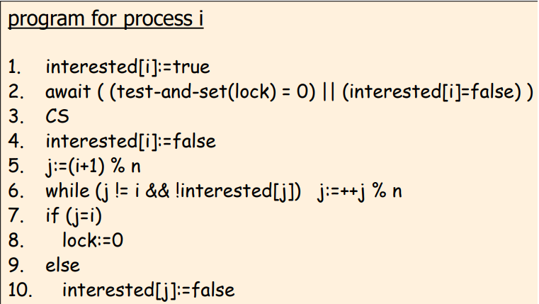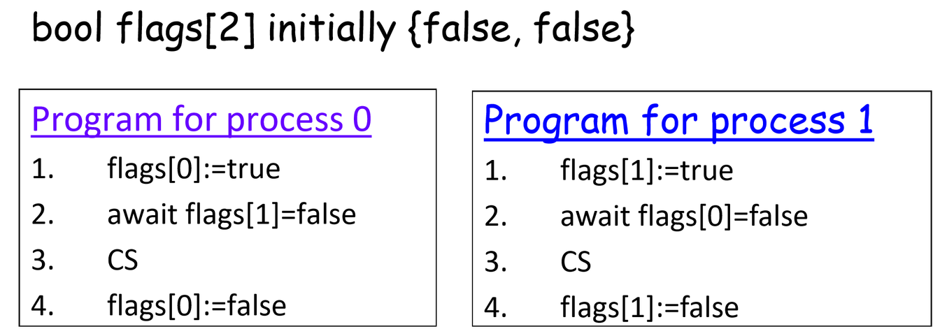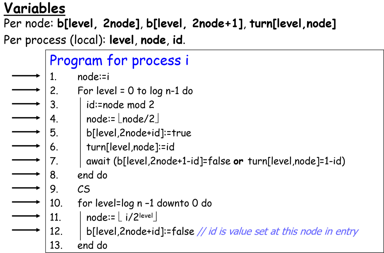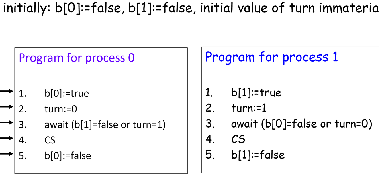 b[i] = true means intention. turn = i, means it is i’s turn to enter the CS. Assume i’m process 1 and i want to enter the CS: if process 0 have no intention, b[1]=false and i’m in. If he does have intention, we’re racing. if the value of turn is 0 on my while loop i get in. else, process 1 gets in. once finished, he sets b[1] = false. means he has no intention to enter. then i can enter. moreover, if process 1 wants immediately to enter again he would set turn = 1, thus he’s stuck in the while loop till i enter.