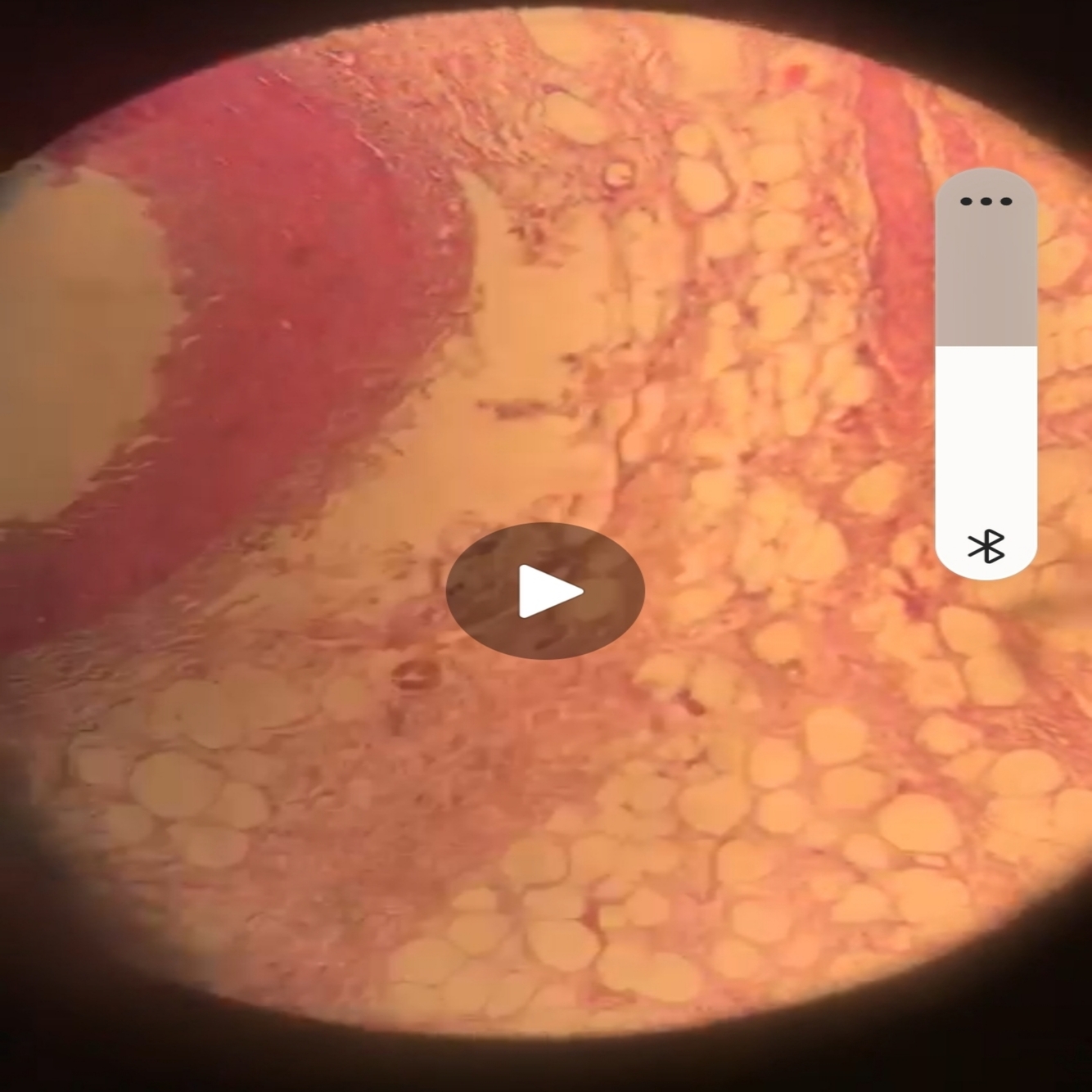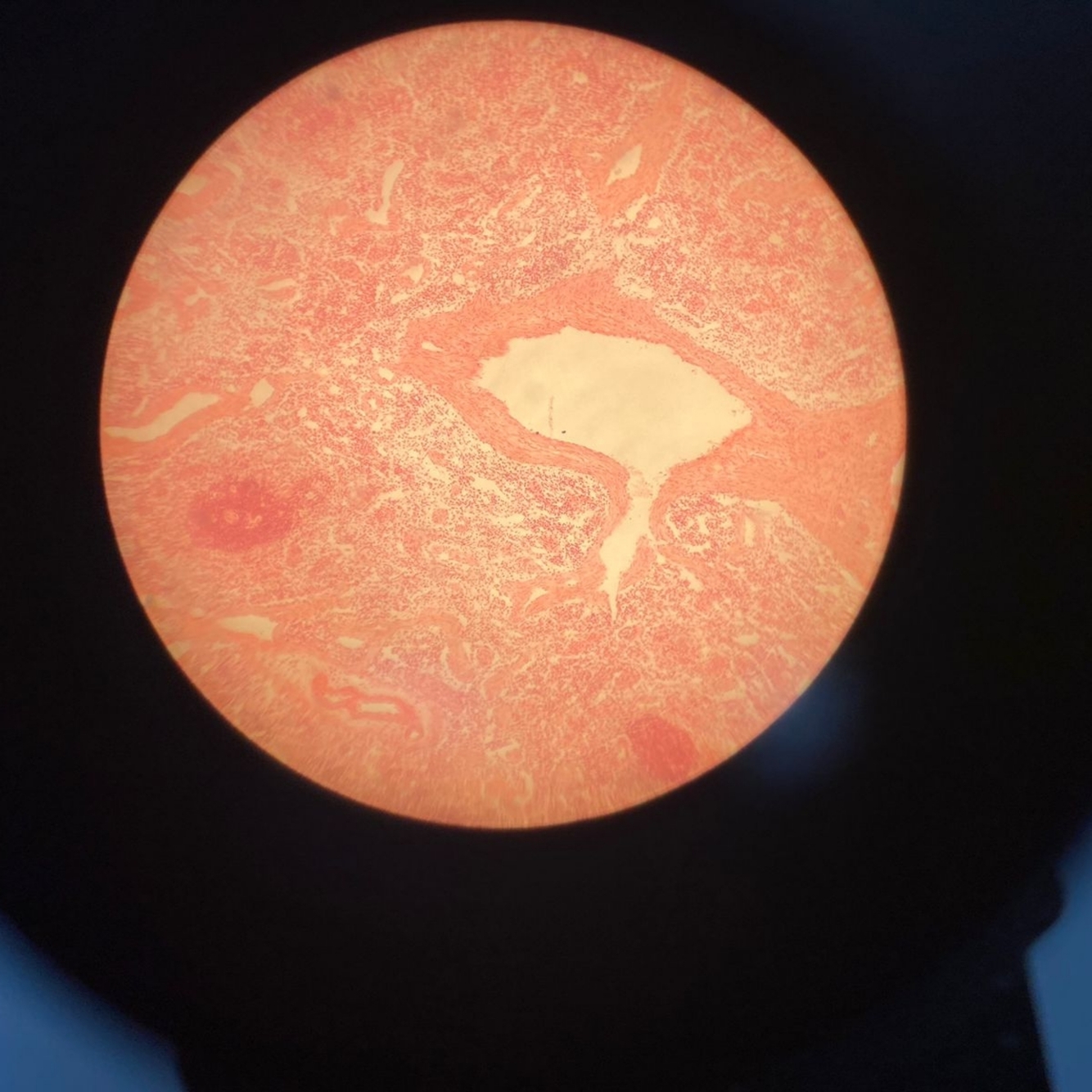 Pink with many vacuoles but some areas very dense pink