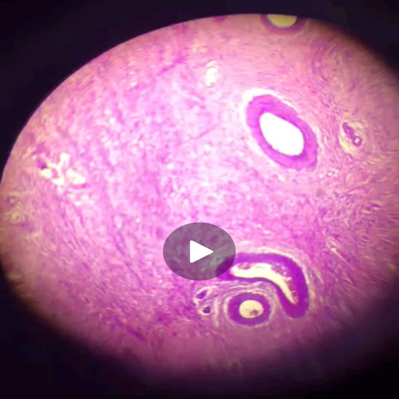 Dense purple with thick ovals of vessel wall visible in darker purple