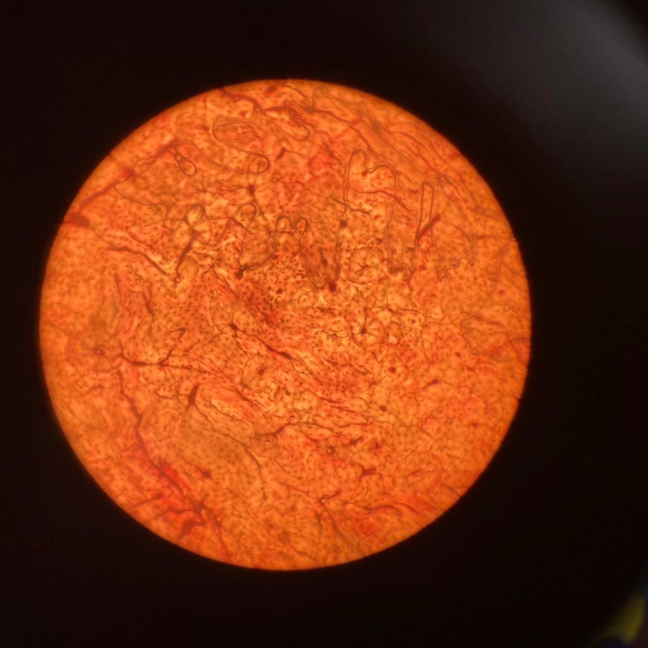 Orange with many dark filaments in various orientations