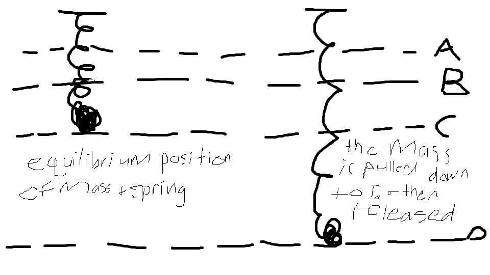 A mass is suspended from a vertical spring. It is set into oscillation by pulling it down a short distance and then releasing it. At which one of the labelled points, during the subsequent motion, will the