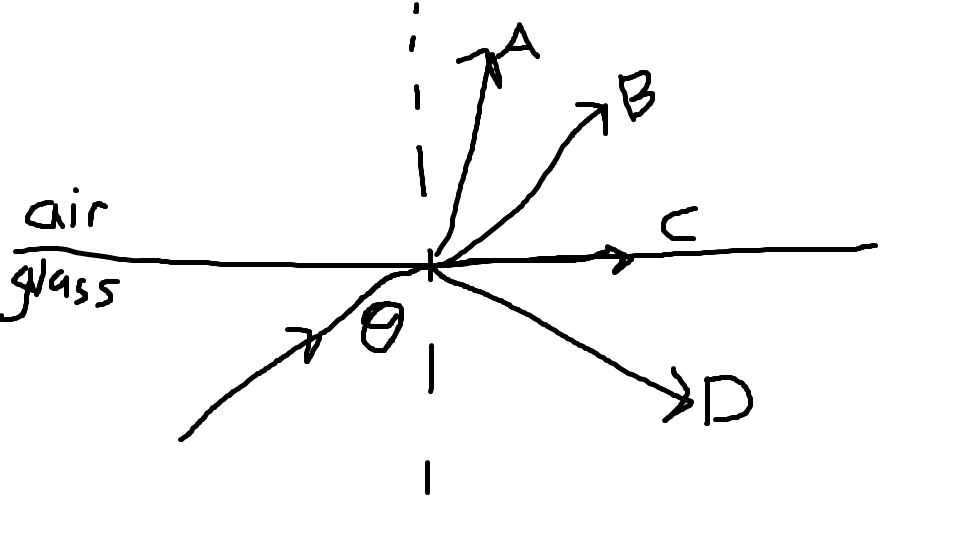 A ray of light travelling in glass is incident on the glass-air boundary at an angle pheta to the normal as shown in the diagram. If pheta is greater than the critical angle which one of the rays best shows the path of the ray?